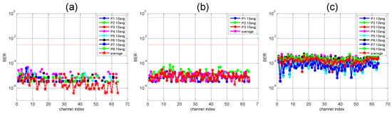 Inspection of Figure 5a clearly reveals that the CMA equalizer exhibits a singularity when the SOP rotation angle is for any value of . We repeated this measurement and added synthetic noise to the experimental data with a power such as the payload-BER equaled the forward error correction (FEC) limit of 10−3. Figure 5b shows that the effect of noise, compared to Figure 5a, is to unsmooth the curves, but the CMA equalizer singularity is still present. Next, the proposed SOP estimation and equalizer initialization algorithm were tested for header sizes of {4, 8, 16, 32, 64} samples. The results of this measurement are plotted in Figure 5c. Inspection of the figure reveals that the average BER stays in a range of approximately [10−3, 5 × 10−3], independently of the header size, which demonstrates that the proposed algorithm solves the CMA singularity problem.