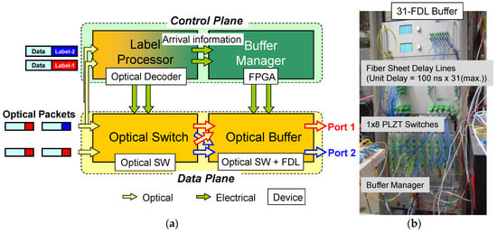In this section, we characterize a 2 × 2 OPS node, shown in Figure 11a, with two strategies to deal with packet contention: optical buffering with FDLs and packet dropping. In the control plane, the label processor consists of multiple optical decoders [42,43] that recognize an input label and send triggering signals to a buffer manager implemented on a field programmable gate array (FPGA) [44,45]. The label generation process is described on Section 3.1. The buffer manager is able to electronically control the optical switch matrix to perform packet forwarding, packet dropping or packet buffering. The optically transparent data plane uses one 1 × 8 PZLT optical switch on each input port. This 2 × 2 OPS node will be the key subsystem in the packet contention resolution experiment of this section and in the packet transmission plus a switching experiment of Section 5.