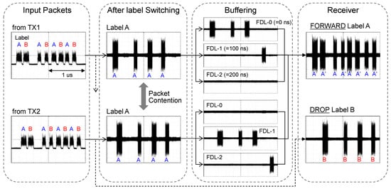 After the transmitter, the set of eight packets from TX1 and TX2 were propagated through different 50 km SMFs plus DCF spans and were input to both input ports of the 2 × 2 OPS node, described in Section 4. In this experiment, the OPS node was configured to forward optical packets with label A of TX1 and TX2 to the same output port in order to emulate packet contention. To resolve this packet contention, FDLs were used as an optical buffer. The buffer manager calculated the delay time required for each packet to avoid collisions and controlled a set of PLZT switching matrices to send each packet to appropriate FDLs having 0, 100 and 200 ns, respectively. On the other hand, optical packets with label B (only from TX2) were sent to the alternative output port without the buffering process (drop process). This whole processing is illustrated in Figure 15, which shows the waveforms processed in the data plane of the OPS node. In the label switching process, packets with label A and label B were separated and four packets with label B of TX2 were output (marked in Figure 15 as DROP). Optical packets with label A were output after the buffering process without any packet loss (labelled FORWARD on Figure 15).