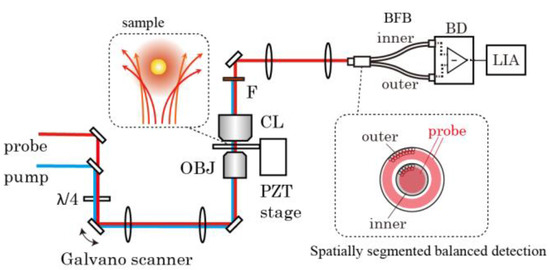 - Miyazaki, J.; Tsurui, H.; Kawasumi, K.; Kobayashi, T. Sensitivity enhancement of photothermal microscopy with radially segmented balanced detection. Opt. Lett. 2015, 40, 479–482. [Google Scholar] [CrossRef] [PubMed]