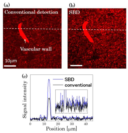 The PT image measured in the SBD using the bifurcated fiber bundle was compared with that measured by the conventional detection scheme. Figure 2 shows the PT images of a slice of mouse brain with and without SBD. It is confirmed that signal intensity in the SBD is about 1.8 times higher than by conventional detection. Furthermore, intensity noise of the LD is reduced by ~40%. Thus, SNR is improved by a factor of 4. This indicates that image acquisition time in SBD is about 16 times reduced from the case of conventional scheme with the same pump power, because SNR is proportion to the square root of the measurement time (time constant of lock-in amplifier). SNR further improves by optimizing the detection aperture using an annular light block placed at the pupil of the condenser lens [34]. It has been demonstrated that SNR was 9.6 times larger than that in conventional detection.