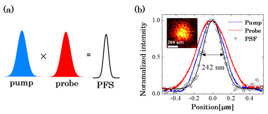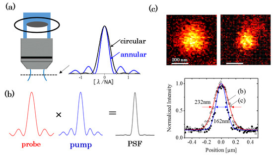 The use of annular beams in pump-probe microscopy further improves spatial resolution. A focusing annular beam is known to exhibits a sharpened main peak with large side lobes in the focal plane (Figure 6a). The application of the annular beam has attracted much attention in the field of scanning microscopy [38,39,40,41]. Several theoretical and numerical studies have suggested that it is possible to reduce the undesired side lobes and improve lateral resolution in nonlinear imaging such as two-photon excitation (TPE) fluorescence microscopy because of square dependence of the intensity (Figure 6b) [39,40].
