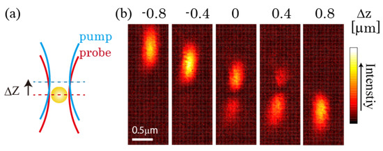 It has been also demonstrated that either of the twin peaks is suppressed by an offset between the focal planes of the pump and probe beams (Figure 4a) [35]. Figure 4b shows PT images of a 20 nm gold nanoparticle with a variety of Δz. PT signal exhibits twin peaks when the focal offset between the pump and probe beam Δz is close to zero. The amplitude images show that either of the peaks is suppressed with increasing or decreasing Δz. The focal offset can be controlled simply by the divergence of the incident beams. This method is simpler than the confocal detection setup and can easily be incorporated into the spatially-segmented balanced detection method.