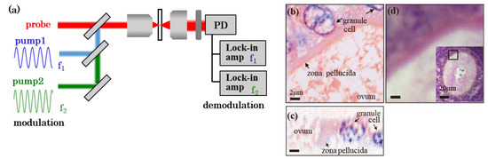 PT spectral images were acquired by using a wavelength-tunable optical parametric oscillator as a pump beam with switching the laser wavelength and repeating scan [4,7]. However, this scheme would cause an error in performing spectral unmixing because of mechanical drift of the tissue or cell migration. As major advances have been made recently in high power LDs with the wavelengths from UV to NIR, simultaneous multi-wavelength imaging can be performed by incorporating multiple LDs and multi-channel lock-in amplifiers in the PT microscope with frequency-division multiplexing technique (Figure 7a) [44]. The spatial displacement of the image between the two colors was estimated to be smaller than 50 nm in the lateral direction and 0.2 μm in the axial direction, which are about one-third and one-fourth of the PSF width, respectively.