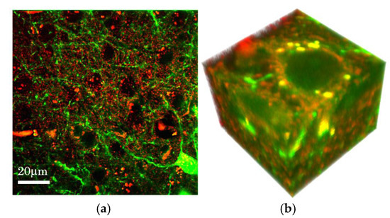 We performed simultaneous PT and fluorescnece imaging of a fixed slice of transgenic mouse brain expressing yellow fluorescent protein (YFP) [33]. Figure 8 shows the results of simultaneous PT and confocal fluorescence imaging of different layers of the mouse brain cortex. Fluorescence images visualize neurons expressing YFP at the dendrite terminals, a dendrite, and cell bodies, respectively. The PT images show distinct structures and organization. Vascular walls can be identified morphologically. They produce strong PT signals as they may contain heme proteins. The cell bodies of the neurons appear as dark shadows. Fine structures are observed in all areas of the brain cortex. Bright specks with diameters of around 1 μm appear surrounding the cell bodies. These are attributable to the lipofuscins in lysosomes as weak autofluorescence is detected [46]. Sponge-like structures of sub-micrometer size cover large areas of the tissue. The combined PT and fluorescence images show that the axon and dendrites visualized in the fluorescence image do not overlap with the fine structures in the PT images. This indicates that the contrasting agent of the sponge-like structure is outside the neuron. A 3D model is reconstructed from a stack of images in discrete z-steps (Figure 8b).