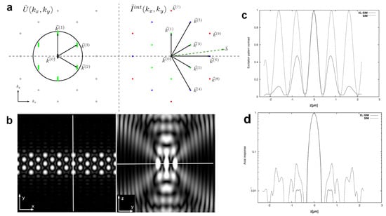 Principle of excitation in XL-SIM. (a) (left): amplitude of the excitation in the microscope objective pupil. The seven first diffraction orders of the hexagonal pattern can pass the pupil, which is indicated by a circle. Note that the diffraction orders are broadened by the line shaped excitation. (right): corresponding spatial frequency spectrum of the integrated excitation intensity and the shift vector ; (b) (left): section of the excitation laser line for a given point in time. The line has a spatial extent of about three periods of the hexagonal pattern. (right): section of the laser line. Note that the white vertical line in the left image corresponds to the white horizontal line in the right image; (c) simulated excitation contrasts for SIM and XL-SIM as a function of defocus; (d) the axial response (confocality) for SIM and XL-SIM as a function of defocus illustrated as logarithmic plot.