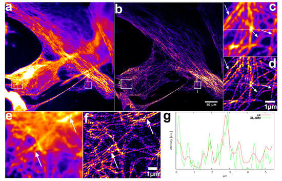 Demonstration of resolution improvement by XL-SIM: (a) line-confocal (LC) image of a tubulin sample. The field of view is ; A corresponding XL-SIM image is shown in (b); because the dynamic range of both images amounts approximately 10 bits, a colored lookup table (fire) has been used; Figures (c,d) or (e,f) show the regions of interest which are marked by `1’ or `2’, respectively. The arrows indicate sample features that are unresolved in the LC image but can clearly be recognized in the XL-SIM image; in contrast to (c), the lack of resolution in (e) is partially caused by detected out-of-focus light; and Figure (g) shows a line profile plot along the white lines in (c,d).