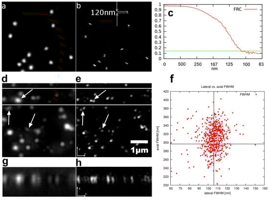 Characterization of resolution improvement ability of XL-SIM: (a) Wide field (WF) image of nanorulers, which have a distance of 120 . The corresponding image for XL-SIM is shown in (b); in contrast to (a), the nanorulers in focus can clearly be distinguished in (b); a plot of a Fourier-ring correlation for an XL-SIM image with the commonly used threshold value of ≈0.143 is shown in (c); according to this threshold, our XL-SIM approach gives a resolution of approximately nm. A volume of green fluorescent microspheres with a diameter of nm has been recorded. An -view of line-confocal and XL-SIM ROIs of the volume are shown in (d,e); the arrows indicate several beads whose distance is to small to be distinguished in the WF image (d) but can be resolved in the XL-SIM image (e); the area between the white horizontal lines in (d,e) is maximum projected in the y-direction and shown as a view of the volume in (g,h). A Gaussian distribution has been fitted to the intensity distribution of 537 microspheres in and z. Corresponding lateral and axial full-width-at-half-maximum (FWHM) values are illustrated in (f).