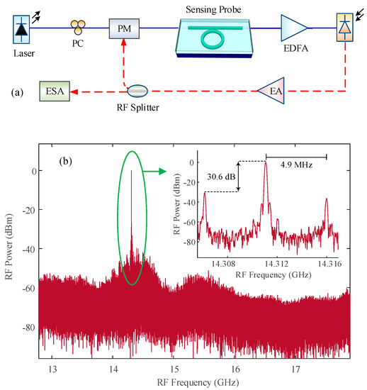 In traditional optical sensing systems, where a change in the sensor measurand is converted into a shift in the optical sensing resonant wavelength, an optical interrogator such as an optical spectrum analyzer is required to convert the wavelength shift into an electrical signal. This, however, raises the issues of sensitivity and speed limitations. In contrast, sensors based on microwave photonic signal processing techniques can conveniently convert the change in the optical domain to a corresponding variation in the microwave domain. The ability to perform measurements in the RF domain, which provides higher frequency resolution, enables a superior method for high resolution monitoring of miniscule changes in the measurand, thus enabling high performance sensing [74]. A much higher interrogation speed can also be obtained since the microwave frequency can readily be measured by a digital signal processor (DSP) with high speed and high resolution. One technique to implement the interrogation of optical sensors is via an optoelectronic oscillator (OEO) system, which is an important system for microwave photonics that enables the generation of high-frequency and stable microwave signals by combining the unique advantages of electronic and photonic components [75,76].