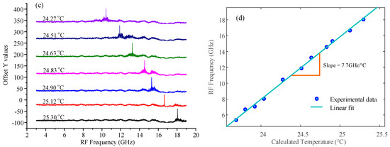 The first steps to developing an integrated OEO-based system was first initiated in [77] where we presented an integrated photonic sensor based on an optoelectronic oscillator with an on-chip sensing probe that is capable of realizing high sensitivity and high resolution. This work engaged the use of a SOI microring resonator to continuously select different RF oscillation modes. As an application example, the targeted measurand was chosen to be temperature. Figure 4a shows the working principle of the proposed OEO based optical sensor that employs an integrated microring resonator as the sensing probe element. The chip was placed under a heat sink with temperature controllability provided by a thermoelectric cooler (Newport) to emulate the effects of disturbance in the ambient temperature. The frequency response of the generated electrical signal at 24.78 °C is shown in Figure 4b, which depicts an electrical signal at 14.3 GHz. The inset of Figure 4b shows the zoomed in response which illustrates a narrowband signal with a linewidth of 0.1 MHz. The next most dominant mode is located at 4.9 MHz away from the peak oscillation mode and shows a mode suppression of 30.6 dB. To investigate the temperature sensing performance, the temperature of the nanochip sensor was varied from 24.27 °C to 25.29 °C. Figure 4c shows the superimposed spectra of the generated microwave frequencies at different temperature points. As the temperature increases, the signal is shifted to a higher frequency where a linear relationship is formed between the temperature change and RF frequency shift, as shown in the linear fit in Figure 4d. The linear dependence of the frequency shift on temperature is estimated to be around 7.7 GHz/°C, thus demonstrating its high sensitivity.
