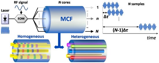 Figure 1 shows the general idea that underlies the TTDL built upon a multicore fiber. The goal here is to obtain at the output of the fiber link or device a given set of time-delayed samples of the modulating RF signal that was injected at the input. This set of replicas must be characterized by a constant basic differential delay ∆τ experienced between adjacent samples. We identify this configuration as a 1D (one-dimensional) TTDL since all the samples are given by exploiting the spatial diversity (or core diversity) behavior of the MCF. However, this approach potentially offers not only 1D, but also 2D (two-dimensional) operation if we incorporate the optical wavelength diversity provided, for instance, by an array of lasers emitting at different optical wavelengths. This very general idea will adapt properly to the particular type of MCF technology employed. In the case of a heterogeneous MCF, we can design each core with a different refractive index profile as to provide a different group delay [,,]. In the case of homogeneous MCFs, where all the cores are in principle identical, we must incorporate dispersive optical elements in each one of the cores [].