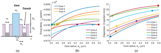 (a) Refractive index profile of the fiber cores; (b) group delay; and (c) chromatic dispersion of each core as a function of the core radius. Each filled circle represents the selected core radius and the corresponding group delay and chromatic dispersion values.