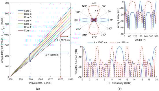The designed seven-core fiber offers a linear and incremental behavior of the group delay of each core as a function of the optical wavelength in a wide wavelength range, as shown in Figure 4a. This allows us to implement tunable TTDLs that can be used as the basic element to perform multiple MWP applications. As a proof of concept, we evaluated the performance of this delay line when it is applied to implement typical signal processing tasks, such as microwave signal filtering and radio beamsteering for phased array antennas. Figure 4b shows the computed responses of the corresponding beamforming (upper part) and filtering (lower part) functionalities for a 10-km link. This delay line allows us the possibility of continuously tuning the free spectral range (FSR) of the filter and the antenna beam direction by changing the operation wavelength of the laser. For instance, we see how changing the operation wavelength from 1560 up to 1575 nm induces a reduction on the FSR from 10 to 4 GHz and a variation on the beam direction from 180 to 90° without any significant degradation due to higher-order dispersion effects.