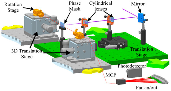 Optical devices built upon the inscription of FBGs in single-core single-mode fibers have been widely investigated as dispersive 1D (1-dimensional) sampled delay lines [], where the use of the optical wavelength diversity allows the tunability of the basic differential delay Δτ. If we incorporate the spatial or core diversity, we obtain a 2D delay line that offers a higher degree of flexibility, versatility and compactness. Actually, previous work on FBG inscription in MCFs has focused mainly on the simultaneous writing of the same grating (i.e., placed at the same position) in all the cores, mainly for sensing and astrophotonics [,]. To inscribe individual gratings in a selective way, we developed the first fabrication method to inscribe high-quality gratings located in arbitrary longitudinal positions along the selected fiber core []. Figure 5 shows the scheme of the FBG writing setup that is based on the moving phase mask technique. First, the laser beam is conditioned by a mirror that is mounted in a piezo-electric transducer that can induce a beam vertical deflection and then by two cylindrical lenses that allow the control of both beam height and width. The beam width and the distance between the fiber and the phase mask were adjusted to control the interference pattern created after the phase mask. For a phase mask with a period of 1070 nm, the maximum width that allows inscription in a single outer core is approximately 23 µm. On the other hand, the beam height, which is determined by the size of the cores and their arrangement in the fiber cross section, was adjusted within the range from 30 to 50 µm.