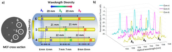 By slightly modifying the above technique, we have fabricated different multicavity TTDL devices, either inscribing the same FBG in groups of cores or in individual cores []. Figure 6a shows, as an example, the scheme of a multicavity device that is based on the selective inscription of FBGs in three outer cores, identified as 4, 5 and 6. The MCF is a commercial seven-core fiber characterized by a cladding diameter of 125 µm and a core pitch of 35 µm. Each one of these cores comprises an array of three uniform gratings, being each one centered at a different wavelength: λ1 = 1537.07 nm, λ2 = 1541.51 nm and λ3 = 1546.26 nm. To assure that the delay line operates in wavelength diversity, we have written the arrays to feature incremental distances between FBGs when going from core to core, i.e., 20-mm, 21-mm and 22-mm distances, respectively, within cores 6, 5 and 4. On the other hand, the spatial or core diversity arises from the incremental displacement between FBGs centered at the same wavelength but inscribed in adjacent cores, i.e., 6-mm, 7-mm and 8-mm displacements, respectively, for the wavelengths λ1, λ2 and λ3. As appreciated from the optical spectra in reflection gathered in Figure 6b, all the FBGs present similar levels of strength with a maximum difference of 3 dB.