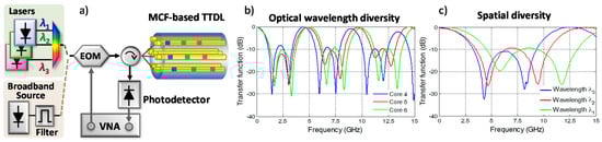 (a) Microwave signal fileting experimental setup; and measured radiofrequency responses operating in: (b) wavelength diversity (for each one of the radiated cores); and (c) spatial diversity (for each one of the optical wavelengths) [].