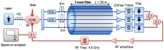 Multicavity or multiloop optoelectronic oscillators [,,,,] can benefit from a reduction of size and weight if the different cores of a multicore fiber act as the required oscillation cavities. In addition, since all the cavities are hosted within the same cladding, this approach provides a fiber integrated medium for enhancing the OEO relative stability against environmental and mechanical fluctuations. Introduced by Yao and Maleki in 1996, first in a single-cavity configuration [], OEOs can generate RF signals with a low linewidth in a feedback-loop structure along a broad frequency range. A high level of spectral purity in OEOs will require a long fiber loop, what translates into a large number of oscillation modes that are separated by a small frequency period. Therefore, very selective RF filters will be required to select only a single oscillating mode. In 2000, dual-cavity OEOs were conceived to alleviate this narrowband RF filter requirement []. In essence, a short loop provides the required spectral separation between adjacent oscillating modes while a long loop is responsible for the spectral purity. The number of loops can as well be generalized to an arbitrary number [,,,,]. In concrete, the work reported in [] experimentally demonstrated three-cavity OEOs by using three different single-mode fiber links whose lengths were multiple of a given reference value.