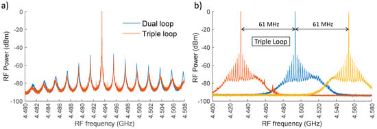 In general, the oscillation frequencies of a multi-cavity OEO verify fo = ni/τi, for ni = 1, 2, …, (i = 1, 2, …, N), where N is the total number of cavities and τi is the time delay experienced in each cavity i including both the optical and the RF delays. The oscillation frequencies for the Vernier configuration verify fo = n/Δτ (for n = 1, 2, …) where Δτ is the incremental delay between cavities that produces the Vernier effect []. Figure 9a shows the measured RF spectrum for the three-cavity Vernier OEO where we matched the oscillating modes of all three cavities at the frequency located near 4.494 GHz. For the sake of comparison, we have also plotted the resulting spectrum for a two-cavity Vernier configuration over the same fiber. A 10-dB power reduction is observed at the spurious peaks corresponding to the minor oscillating modes of the single cavities when going from two to three loops. Figure 9b gathers three consecutive oscillating modes for the 3-loop configuration featuring a FSR of 61 MHz. We can see that the 30-MHz RF filter bandwidth is then narrow enough to allow single-mode oscillation for the Vernier configuration. Regarding the frequency stability of the OEO, we observed that the oscillating mode could be shifted a few kHz due to the lack of proper isolation and, probably, due to possible fluctuations of the pump current applied to the EDFAs. This could actually induce non-desired mode-hopping effects. Nevertheless, the short lengths that characterized the fiber loops contribute to minimize this effect since they result in single-cavity FSRs (when each cavity operates in isolation) on the order of 2 MHz. Even more important, we observed that this effect was strongly reduced as we increased the number of cavities from two to three, so we can consider our three-cavity Vernier architecture considerably robust against possible mode hopping effects.
