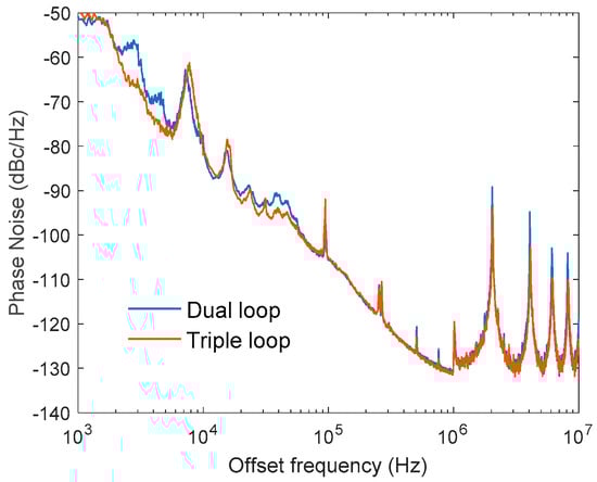 Experimental phase noise spectrum of a multi-cavity optoelectronic oscillator using a 20-m seven-core fiber comparing dual- and triple-loop Vernier configurations [].