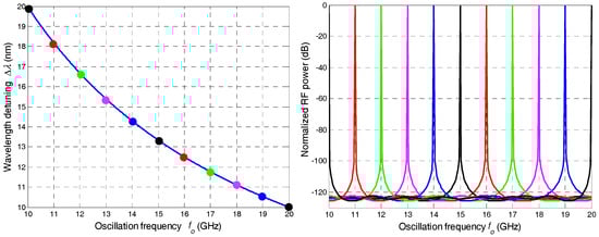 where τgo is the group delay per unit of length at a given anchor wavelength λo and Δλ = λ − λo A distinctive feature of this OEO is the possibility of tuning the oscillation frequency by changing Δλ, in other words, by using a tunable laser. Figure 11 shows this relationship (Figure 11, left) and the oscillation frequencies (Figure 11, right) in between 10 and 20 GHz, computed for a set of selected values of Δλ.