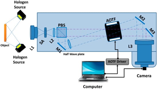Compared to the spectroscopy system [,], the size of the beam is much larger in an imaging system. Therefore, it is not practical to directly use the two first-order diffracted signals at orthogonal polarization states. Instead, the randomly polarized input signal is separated into two linearly polarized components by a polarizing beam splitter (PBS). Then, one polarization path is rotated 90 degrees by a half waveplate such that both beam paths have the same polarization direction. As shown in Figure 1, two 150-watt tungsten-halogen lamps are used as illumination. Randomly polarized signal from the object is collected by a zoom lens L1 (Canon EF-S 55–250 mm f/4–5.6 IS) and focused at the first focal plane where a square aperture (8 × 8 mm) is used to block background noise. The formed image is then collimated by an achromatic lens L2 (EFL = 250 mm, Thorlabs, Newton, NJ, USA). A polarizing beam splitter (PBS513, Thorlabs) splits the randomly polarized light into two paths with orthogonal polarization states: e and o polarized light. The transmitted o polarization light—which matches the AOTF optimized polarization direction—will continue to incident on an AOTF crystal (TF625-350-2-11-BR1A, Gooch & Housego, Cleveland, OH, USA).