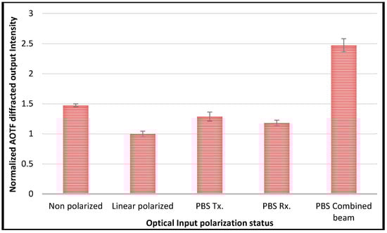 The diffracted light intensity of the AOTF crystal in: (1) randomly polarized input directly passing an AOTF; (2) linearly polarized input (i.e., #1 + linear polarizer) and directly passing an AOTF (polarization aligned with the AOTF optimal direction); and (3) randomly polarized input (i.e., #1) going through the dual polarization setup. The two polarizations paths were measured separately (PBS transmitted, PBS reflected) in addition to the combined beam (PBS dual beams), respectively. All the displayed diffracted intensities are normalized with respect to the linear polarized input.