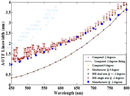 The AOTF-HSI spectral line-width (FWHM—full width half maximum) was measured across its operating spectral range, as shown in Figure 3. In addition, theoretical values at different incident angles (θi = 0, ±2, ±4 degrees) were computed based on Equation (1)) and plotted for comparison purposes.