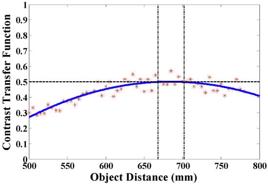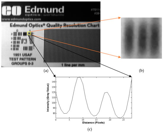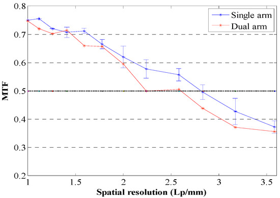 The modulation transfer function (MTF) measurement is commonly computed to characterize the spatial resolution of an optical system. To compute an imaging system’s MTF, the ratio of the acquired image modulation and the original object modulation is accounted as demonstrated in Equation (3) []: