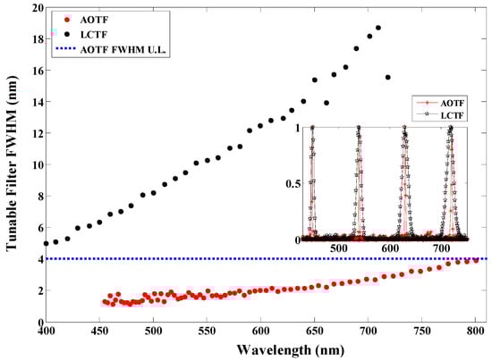The imager’s spectral resolution evaluation in the case of switching between AOTF (red circles) and liquid crystal tunable filter (LCTF, black circles) along the wavelength operating range for each filter. Samples of filtered/diffracted bands are also included in the embedded figure. A blue dotted horizontal line is drawn with a value equal to the lower spectral resolution limit of the AOTF-HSI. This line illustrates that the AOTF has superior linewidth in contrast with the highest spectral resolution of the corresponding LCTF-HSI.