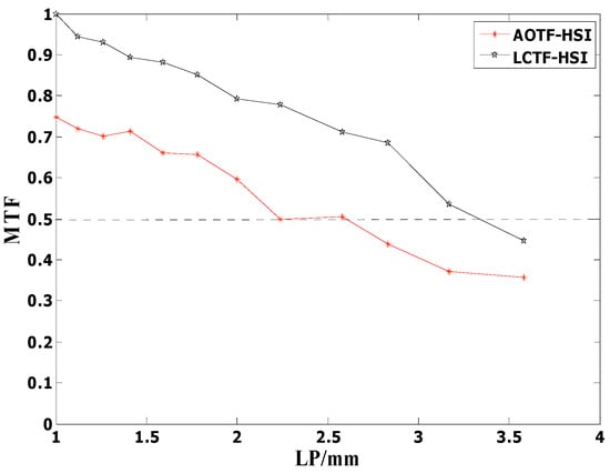 In order to evaluate AOTF and LCTF in the spatial domain, a USAF-1951 target was used []. The modulation transfer function (MTF) for elements of both group zero and one was calculated according to Equation (3), and was plotted as shown in Figure 8.