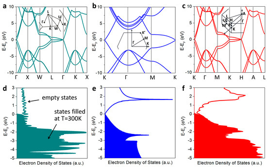 In Figure 2d–f, we show the population of electron states filled at room temperature ( filled curves) and the density of electron states available for the upward electron transitions in all the three materials considered. As can be seen in Figure 2, the electron density of states calculated with the ab-initio DFT simulations deviates significantly from the parabolic band approximation used in some previous works [19,20]. Instead, electron densities of states for different materials exhibit complex energy distributions that peak at different energies relative to the Fermi level in the material.