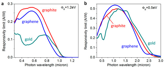 Responsivity limits for the IPE photo-detectors with gold (teal), graphene (blue), and graphite (red) as the absorber materials as a function of the photon wavelength for two potential barrier heights, (a) and (b).