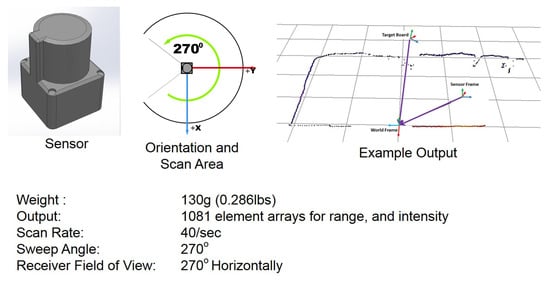 Laser Scanning Radar or Light Detection and Ranging (LiDAR) [1] sensors are a common place in the the navigation and mapping world. There are many commercial-off-the-shelf (COTS) LiDAR products for many different applications ranging from hand-held 3D mapping sensors to large 3D sensors for autonomous driving cars to even more sophisticated space-based LiDAR sensors used to monitor the health of crops across nations [2]. The LiDAR sensor investigated in this paper was the Hokuyo UST-20LX Scanning Laser Range Finder (Hokuyo, Osaka, Japan) [3] as seen in Figure 1. The sensor summary represented in Figure 1 also illustrates the sensor’s field of regard, and the output data as a 2D planar point cloud.