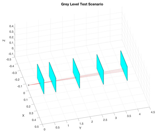 The first test, based on Figure 2, was to measure the nominal range returns across a typical range against a matte white target board. The sensor source was represented by the blue circle, the red lines represents the looking geometry of the active sensor array, and the blue squares are the locations of the target boards. The ranges to be tested were at 0.5 m, 1.0 m, 2.0 m, 3.0 m, and 4.0 m. More than 10 k data points were collected and analyzed. Once completed, a test to measure the beam divergence was conducted at ranges of 0.5 m, 1.0 m, 2.0 m, 3.0 m, and 4.0 m. From here, the next major test was the range test against a matte black and a matte white target at ranges between 1.0 m, 3.0 m, 10.0 m, and 20.0 m. Once this was completed, an investigation using a gray scale target set illustrated by Figure 4 was desired at ranges between 0.5 m, 1.0 m, and 2.0 m.