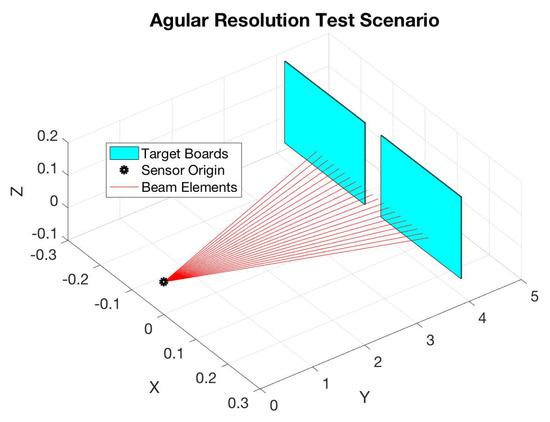 Continuing to investigate the pixel range error capability from the beam divergence test previously conducted, the angular resolution test was performed. The generalized test scenario can be represented by Figure 3. Here, the sensor is placed at the black dot in Figure 3 representing the sensor origin. From here, two matte white target boards are placed such that they share the same orientation, with the collective target set normal vector pointing back to the sensor origin. This creates a perpendicular “impact” point for the LiDAR sensor’s photons. The target distances measured are at 3.0 m and 10.0 m. This distance did not allow for use of the truth data garnered through the VICON chamber and distances were again measured solely via a tape measure. This measurement was performed three times each such that reasonable accuracy was performed. The goal of this test was not to evaluate distance, as such the accuracy of the distance was not extremely critical, but rather to characterize effects near those representative distances and to identify how small a feature can be to be detected with a reasonable confidence. Once the test was set-up, initial data collect is performed for a baseline. Then, the target boards are adjusted laterally such that a 1/8 gap now appears between them with respect to the sensor origin. This is repeated in 1/8 increments to 1/2. Each data set collects at least 10 k data points. This overarching procedure is repeated again at 10 m.
