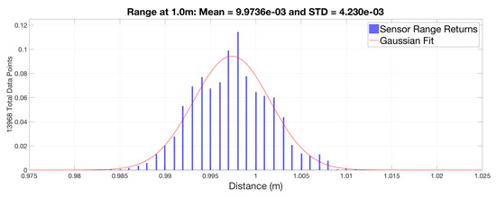 Figure 5 shows a histogram of the collected data points for the 0 sensor output at the 1.0 m distance. The actual sensor data was represented by the histogram in blue, and the Gaussian distribution pattern describing it was in red. An item of note was that the sensor gates the range return into 1 mm increments. Therefore, the natural tolerance of the sensor was mm due to the range gating of the internal electronics.