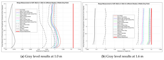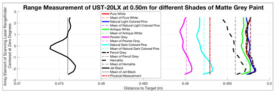 The results can be seen in Figure 7, Figure 8 and Figure 9. During this test, there was an anomaly at a test range of 1.5 m so the data for that distance was collected at 1.6 m and was annotated in Figure 9b. For this scenario, the test began with the pure white target board and that distance was used as the baseline for the remainder of the series. For example, the test at 0.50 m was started by placing the pure white target board in position as indicated by the thick solid red line. The range data was then taken, and the remainder of the targets were placed in the same exact location. The error in the range was with respect to the solid red line.