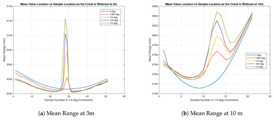 Figure 10a shows the test results at a distance of 3 m from the sensor as the gap increased according to Table 4. Across 10 k samples, the mean was taken to produce the given results and it was very apparent that there was a discontinuity in the surface when the gap was as small as 6.65 mm, even though the angular separation between the beam samples are 1/4 degrees according to the manufacturer’s specification [3].