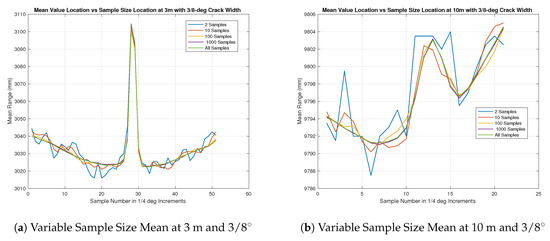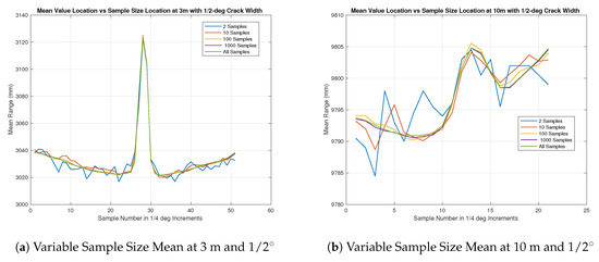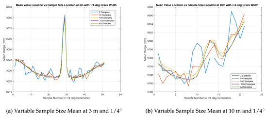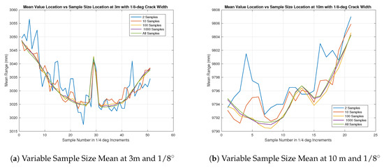 In all cases, it appears that the mean sample waveform, across all but ones calculated with the lowest number of samples show a constant gap width of about 5–6 sensor-beam elements. This corresponds to roughly 1–1.5 degrees. The largest sized gap under test had an angular resolution of only 1/2 degrees, which was equivalent to two sensor beam elements. With this in mind, the results appear to describe anything below 1/2 degrees as about 1.5 degrees, and it could be inferred that this will hold true as the angular distance of the gap increases. Another interesting note is the comparison between the “b” series in Figure 10, Figure 11, Figure 12, Figure 13 and Figure 14 as compared to the “a” series. In theory, the angular resolution is the same in each figure and therefore should be equal if no other factors are affecting the range returns. It can be seen that this is not the case. Combining this information with the previous insights gained through the beam divergence tests, and of the longer range black and white range test, it can be surmised that the longer distances influence the range returns. This influence has distorted the features in the target plane and causes it to be larger, but not as pronounced as it should be.