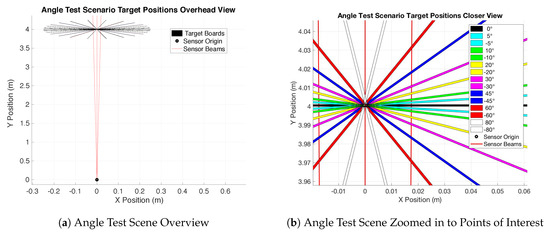 The last major test was what we are calling the target angle test. This test influences both the pixel range error and pixel mapping characteristics of the sensor. In this scenario, the LiDAR sensor is placed at the sensor origin as seen in Figure 15a. It then propagates to a white matte target board placed at 4.0 m. The goal of this test is not to evaluate a specific characteristic due to distance but of a pixel range error capability. The target distance of 4.0 m was decided, as this allowed for more room to manipulate the target into extreme orientations. This was the farthest distance that could be achieved with high confidence in the VICON range measurements, while simultaneously ensuring a large enough beam spot size to force a potential error, inducing a situation through extreme target orientation angles up to . At a closer distance, the spot size becomes smaller and can limit the error inducing potential during the test. The chosen distance also amplified the errors such that it was reasonably measurable while still being in the confines of the VICON chamber. Figure 15a,b presents the test scenario for evaluation. The target range was centered at 4.0 m, while a target board was oriented between a range of angles of as referenced in Figure 16. The goal of this test was to gain an understanding of how the beam spot size affects the range error as the orientation from beam normal was increased. Ideally, the spot size would be extremely small such that the target orientation does not affect the sensor range return.