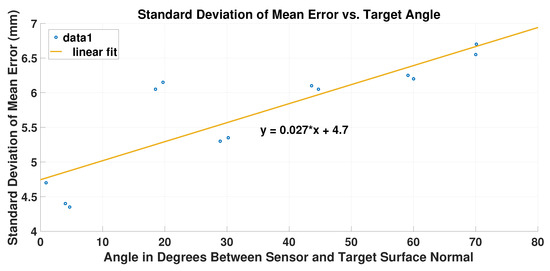 Figure 16 illustrates how the standard deviation of the error changes with respect to the magnitude of the target’s orientation as compared to the sensor origin. As expected, the larger the orientation angle with respect to the sensor beam propagation vector, the larger the standard deviation of the range error. In this figure, a simple linear fit is used to show the general trend in order to enlighten the reader. The rough linear fit implies that there may be a an overarching standard deviation of mean error across the whole spectrum of angle in the order of about 4.5 mm. This can be largely taken into account by the range error previously discussed. If removed, then the increase in the error variance is decreased uniformly across Figure 16. Even with this potential decrease, the potential error caused by the target’s orientation can be over a half a centimeter at a range of 4 m.