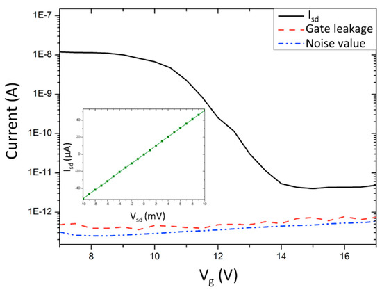 The electronic characteristics of the fabricated devices were measured using a probe station. The results show ohmic contact between the source/drain electrodes and the NW, along with good gate modulation via the side-gate, as shown in Figure 5. The source-drain current was reduced from 10−8 A to 10−12 A when the gate voltage was increased from 10 V to 14 V. The gate leakage and noise value during the measurements were both 10−13 A, which indicates a good measurement environment with negligible noise. This gate modulation indicates the potential for terahertz detection starting at a gate voltage of 10 V.