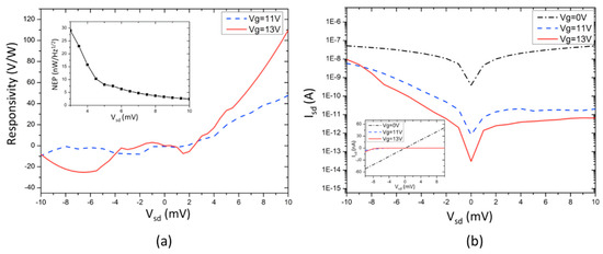 The I-V characteristic of the NW-based FET (Figure 6b) was asymmetric when the gate voltage of 11 V and 13 V were applied to the device, which leads to the asymmetric THz photoresponse of the device with respect to the source-drain voltage. Moreover, the measurement results exhibit higher responsivity under higher gate voltage (13 V) when the source-drain current Isd is nearly vanishing. Such a behavior can be explained using a simple diffusive model: [31,32]