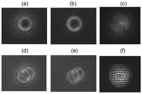 The peripheral vortices that surround the central vortex, located at a radius , are seen as long as , where R is the visible radius of the beam. This sets a lower bound for the value of in Equation (2), which depends on the type of vortex mode: lower for non-Laguerre–Gauss modes. The pattern of the case of in Figure 4a was created with . The peripheral vortices are close to the edge of the beam. Depending on the type of mode, can be between and .
