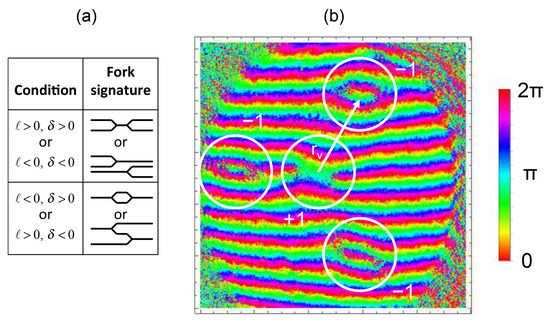 The shear interference pattern of a beam bearing an optical vortex of topological charge ℓ has the following characteristics [23] (details of the interferometer and a visual schematic of the angular parameters are shown in Section 5.1):