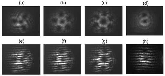 Figure 3 shows four cases with distinct values of : , , and . The figure shows views of the mode images in Panes (a–d) and the shear interferograms in (e–h). All cases were taken in the far field produced by the non-amplitude modulated encoding. The mode images show dark regions where the vortices are located. The presence of a vortex is only confirmed by the appearance of the forked dislocations in the interferograms. The first case (a,e) is similar to the one in Figure 2b, featuring one central +1 vortex surrounded by three vortices. The second case in (b,f) has again a central vortex surrounded by five vortices. The third case with underscores the method, showing a central vortex, surrounded by six vortices. The case involves . When , the peripheral vortex is along the horizontal axis of the pattern. When the fringes are lined up along the direction connecting the centers of the displaced modes, two forks connected by their handle reveal positive vortices, whereas two forks conjoined by the tines reveal negative vortices. If the alignment is not as good, then the conjoined forks are laterally displaced, as illustrated in Figure 2a, so that for example, in the case of negative vortices, the forks share only one tine. They can also share no tines and just be laterally displaced. We can also make adjustments to a second tilt of the air-spaced interferometer to tilt the fringes along the direction that connects the centers of the displaced vortices. The case of Figure 2b shows clearly that the forks representing each vortex are joined by both tines. Depending on the value of the local phase difference between the two interfering reflections, the forks are more clearly observed either via the bright or dark fringes.