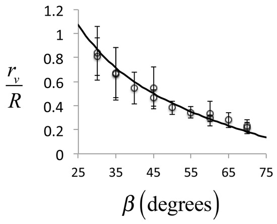 We did an analysis of the variation of with by measuring the values of in the images. In Figure 5, we show as a function of for the case of . The uncertainties are standard deviations of the measurements. We compare those measurements with the predicted value of scaled by a factor of . We found similar agreement with two other cases that we studied, but using other scalings.