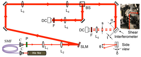 The entire layout of our optical setup is shown in Figure 6. The output of a helium-neon laser was spatially filtered by passage through a single-mode fiber (SMF) coupled to collimators (C). The polarization of the beam was adjusted for optimal diffraction with a spatial light modulator (SLM). The light incident on it was expanded via lenses L and L. The first-order diffraction off the SLM was expanded further with lenses L and L and divided by a beam splitter to observe the mode with the digital camera. The second beam expansion was needed for a greater overlap of the two sheared reflections. The light transmitted by the beam splitter was steered onto the shear interferometer. We also used a single-element shear interferometer to insure that the input beam had a maximum radius of curvature. The beam bearing the shear interference pattern was slightly focused by a lens to fit the mode within the digital camera sensing element.