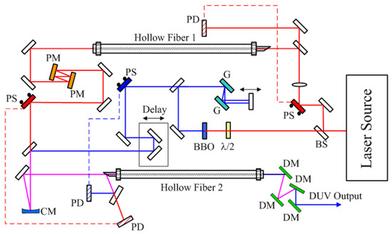 To generate a high-quality DUV pulse suitable for ultrafast spectroscopy, a broad-band chirped-pulse four-wave mixing method (BBCPFWM) was demonstrated [42,43]. The scheme of the system is depicted in Figure 3. The basic pulse source is a Ti: Sapphire laser (Spitfire Ace, Spectra Physics, Santa Clara, CA, USA.). The energy, duration, and repetition of the output pulse beam are 2.5 mJ, 35 fs, and 1 kHz, respectively. It is split into two beams. They have pulse energies of 900 μJ and 300 μJ, the sum of which is smaller than 2.5 mJ due to beam pointing stabilizer mirror (PS), lens, beam splitter (BS), and half-wave-plate (λ/2) as shown in Figure 3. The 900 μJ pulse is introduced to a BBO crystal to generate a second harmonic (SH) near UV pulse. The UV pulse is negatively chirped after passing through two phase-delay controlled chirped mirrors (PM). The other fundamental pulse of 300 μJ is focused into hollow core fiber 2 filled with krypton gas (630 Torr) to obtain broadband supercontinuum in NIR. Then, the positive chirped NIR pulse and NUV pulse are both coupled into another hollow core fiber filled with argon gas (61 Torr), where they are spatially and temporally overlapping. In this second hollow fiber, a broadband and negative chirped DUV pulse is generated by the BBCPFWM process. Just after the second hollow fiber, a clean and well-compressed DUV pulse could be obtained at a certain distance assisted by the positive GVD in the air just after this second hollow fiber. After the collimation of the output beam, the NIR and NUV pulses are carefully eliminated by a set of four dichroic mirrors (DM) step by step.