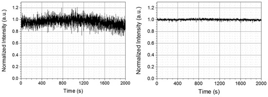 For the spectroscopy application based on the pump-probe experiment, the long-time stability of the intensity of laser spectrum is of vital importance to obtain reliable data. However, the stability of the DUV laser pulse energy and spectrum after the hollow fiber is often not good enough to be used in a real-time spectroscopy experiment [38]. This is because the fluctuations of the laser beam pointing before the hollow fiber induce substantial variations in the pulse duration, spectrum, and energy of the output pulse. Especially in the present two-step scheme as shown in Figure 3, since two hollow fibers are introduced, the stability situation becomes even more serious. Therefore, it is highly desirable to stabilize the coupling of beam into the hollow fibers. The instability is induced by the change in the propagation direction and point of incidence of the beam before the hollow fibers which can be controlled by the reflection mirror of the beam to be coupled. The stabilization is attained by the feedback systems of the beam intensity in front of the entrances of the fibers to the mirror pairs in front of the fibers [42,43]. In the left part of Figure 5, the stability of DUV output power intensity is measured for 2000 s without the feedback system. The RMS noise is over 10%, which is not acceptable for the pump probe experiment. To maintain a stable DUV pulse output, three beam pointing stabilizers (PS) were used for each input beam before it was focused into the hollow fiber. Pointing detectors (PD) sense the change of intensity and feedback to PS to adjust the azimuthal and elevation angles of PS mirrors. As shown in the right part of Figure 5, after the stabilization, the DUV laser output is improved to 1.04% RMS, being measured for the same time length as without the stabilizer.